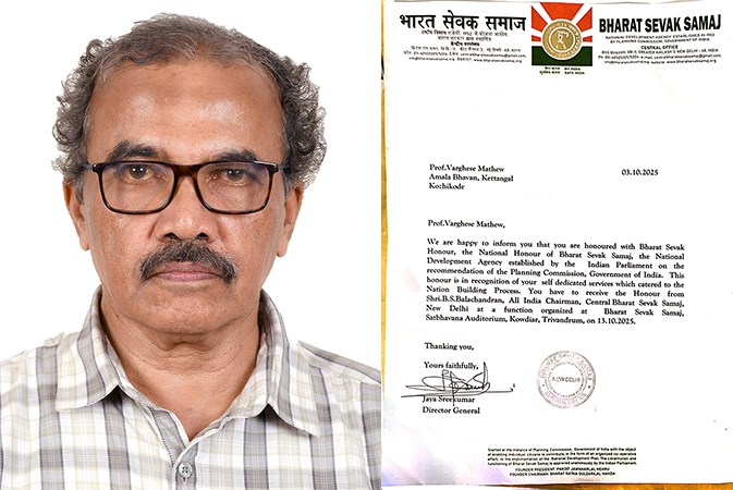 കോഴിക്കോട് : എൻ ഐ ടി കാലിക്കറ്റ് ഇന്ത്യൻ നോളജ് സിസ്റ്റംഗവേഷകൻപ്രൊഫ വർഗീസ് മാത്യുവിന് ഭാരത് സേവക് സമാജിൻ്റെ