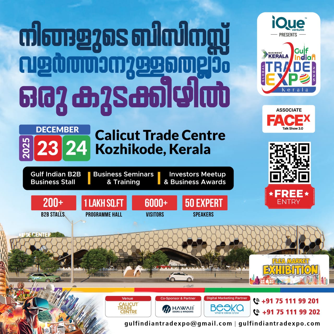 കോഴിക്കോട് :ബിസിനസ് കേരള സംഘടിപ്പിക്കുന്ന ഐക്യൂ വെഞ്ചേർസ് ഗൾഫ് ഇന്ത്യൻ ട്രേഡ് എക്സ്പോ കാലിക്കറ്റ് ട്രൈഡ് സെന്ററിൽ ഡിസംബർ 23 നും 24 നും ‘